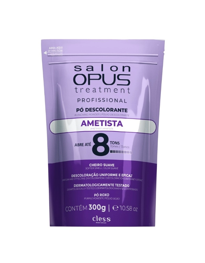 SALON OPUS PROFISSIONAL PÓ DESCOLORANTE AMETISTA foi desenvolvido para clarear os cabelos até 8 tons. Sua ação gradativa garante uma descoloração uniforme e eficaz, que auxilia a neutralizar tons amarelados, mantendo os cabelos bonitos e saudáveis. COMO USAR: SIGA RIGOROSAMENTE AS INSTRUÇÕES DE USO E FAÇA A PROVA DE TOQUE E DE MECHA ANTES DE APLICAR O PRODUTO. Despeje o Pó Descolorante Salon Opus em um recipiente não metálico e adicione aos poucos a Água Oxigenada Salon Opus. Para 1 medida de Pó Descolorante Salon Opus, utilize 2 medidas de Água Oxigenada Salon Opus. Misture com uma espátula não metálica até formar um creme homogêneo e aplique sobre os cabelos secos. Deixe agir de 10 a 45 minutos no máximo, conforme o grau de clareamento desejado, estrutura, porosidade e cor base do cabelo. Caso necessário, reaplique o produto até obter o grau de clareamento desejado, conforme a saúde dos fios. Não se exponha ao sol durante a aplicação. Enxágue com água morna e lave os cabelos com shampoo e condicionador para a remoção total do produto. Recomendações de volumagem: 10 volumes – clareamento de pelos. 20 volumes – clareia de 2 a 3 tons. 30 volumes – clareia 3 a 5 tons. 40 volumes – clareia de 6 a 8 tons. PROVA DE TOQUE: Prepare um pouco de produto e aplique no antebraço ou atrás da orelha e deixe agir pelo tempo de ação indicado. Em seguida lave o local e aguarde 24 horas, caso surjam sintomas de enjoos, irritações, ardência ou vermelhidão no local aplicado, ou proximidades, fica comprovado a hipersensibilidade ao produto e, portanto, o mesmo não deve ser utilizado. TESTE DE MECHA: Prepare uma pequena quantidade do produto e aplique em uma mecha no alto da cabeça, deixando o tempo de ação indicado e depois lave os cabelos. Caso o cabelo apresente quebra, elasticidade ou aquecimento durante a aplicação, o produto não deverá ser utilizado. ADVERTÊNCIAS: CUIDADO! Contém substâncias passíveis de causar irritação na pele de determinadas pessoas. Pode causar reação alérgica. Fazer a Prova de Toque antes de aplicar. Este produto somente deve ser utilizado para o fim a que se destina, sendo perigoso qualquer outro emprego. Não usar em cílios e sobrancelhas. Não utilizar antes ou após qualquer tipo de tratamento químico, tais como tintura, progressiva à base de sais metálicos, permanente ou alisamento. Conservar o produto em local fresco e ao abrigo da luz e calor. Após o uso, lacre-o bem, pois o manter aberto pode reduzir a eficácia do produto. Não reaproveitar a embalagem. Não se recomenda o uso ou a aplicação deste produto em gestantes. O produto é impróprio para o uso em crianças. Não aplique o produto se o couro cabeludo ou a pele apresentar lesões, ou irritações. Não ultrapassar o tempo de aplicação indicado. Em caso de irritação da pele, lavá-la abundantemente com água e evitar exposição ao sol. Caso o produto caia nos olhos, lave imediatamente com água em abundância até o remover completamente e procure um médico. Não se expor ao sol durante a aplicação. Mantenha o produto fora do alcance das crianças. O uso indevido deste pode causar danos no organismo em geral. Recomenda-se o uso de luvas adequadas. Contém amônia. INGREDIENTES | INGREDIENTS: sodium silicate/silicato de sódio, talc/talco, ammonium persulfate/persulfato de amônio, potassium persulfate/persulfato de potássio, hydrated silica/sílica coloidal hidratada, hydroxyethylcellulose/hietelose, xanthan gum /goma xantana, ci77007/corante azul ci77007, dolomite/dolomita, magnesium carbonate/carbonato de magnésio, aqua/água, tetrasodium edta/edetato dissódico, amethyst powder/ametista em pó.