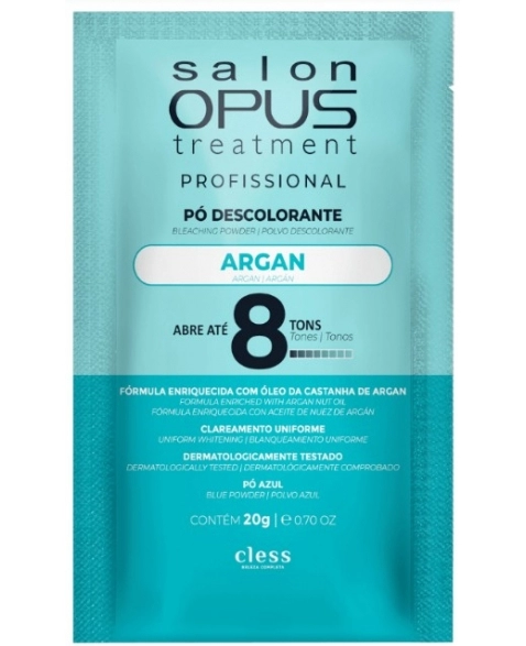 SALON OPUS PROFISSIONAL PÓ DESCOLORANTE ARGAN foi desenvolvido para clarear os cabelos até 8 tons. Sua fórmula enriquecida com Óleo de Argan, auxilia nas propriedades suavizantes e maciez dos cabelos durante o processo de descoloração.