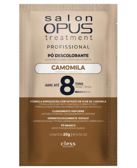 SALON OPUS PROFISSIONAL PÓ DESCOLORANTE CAMOMILA foi desenvolvido para clarear os cabelos até 8 tons. Sua fórmula enriquecida com Extrato de Flor de Camomila, auxilia nas propriedades suavizantes e promove maciez nos cabelos durante o processo de descoloração.