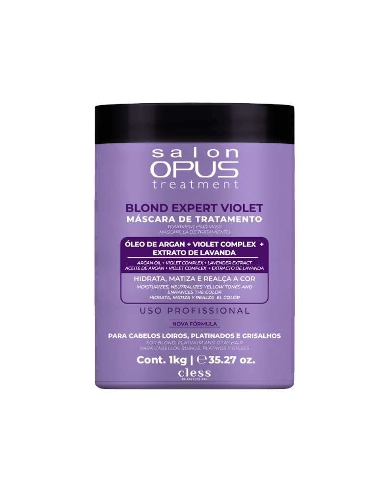 A Máscara de Tratamento Salon Opus Blond Expert Violet trata, hidrata, repara, define e flexibiliza os fios. Auxilia na eliminação do indesejado tom amarelado causado por oxidação natural, promovendo brilho prateado especial aos cabelos loiros (descoloridos ou com mechas), brancos ou grisalhos. Sua fórmula nutritiva com propriedades antioxidantes aliadas ao pigmento violeta, além da ação antienvelhecimento, auxilia na neutralização do tom amarelado, hidrata os fios deixando-os mais macios e brilhantes. Além de tratados, condicionados e totalmente reparados, seus cabelos ficam mais leves, brilhantes e saudáveis.