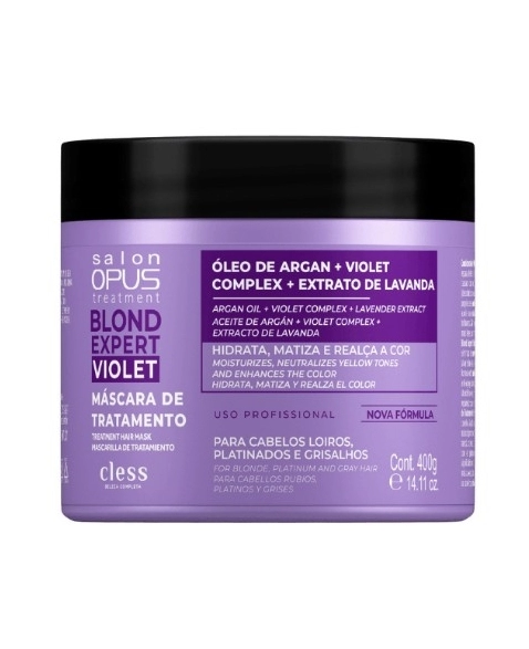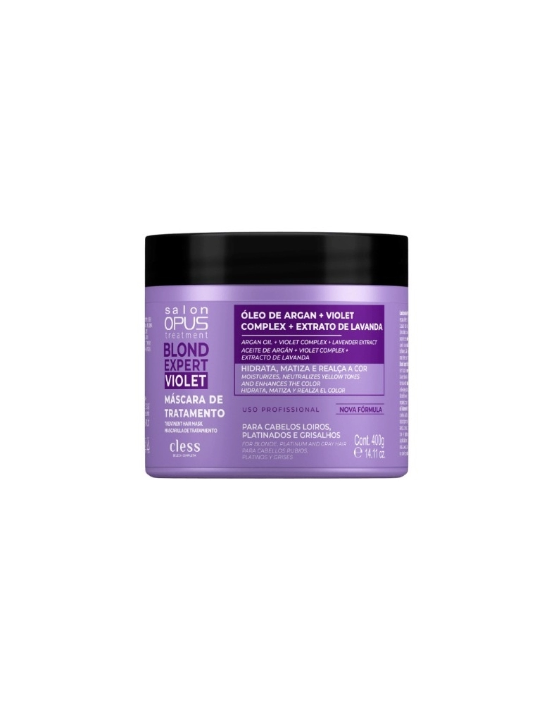 A Máscara de Tratamento Salon Opus Blond Expert Violet trata, hidrata, repara, define e flexibiliza os fios. Auxilia na eliminação do indesejado tom amarelado causado por oxidação natural, promovendo brilho prateado especial aos cabelos loiros (descoloridos ou com mechas), brancos ou grisalhos. Sua fórmula nutritiva com propriedades antioxidantes aliadas ao pigmento violeta, além da ação antienvelhecimento, auxilia na neutralização do tom amarelado, hidrata os fios deixando-os mais macios e brilhantes. Além de tratados, condicionados e totalmente reparados, seus cabelos ficam mais leves, brilhantes e saudáveis.