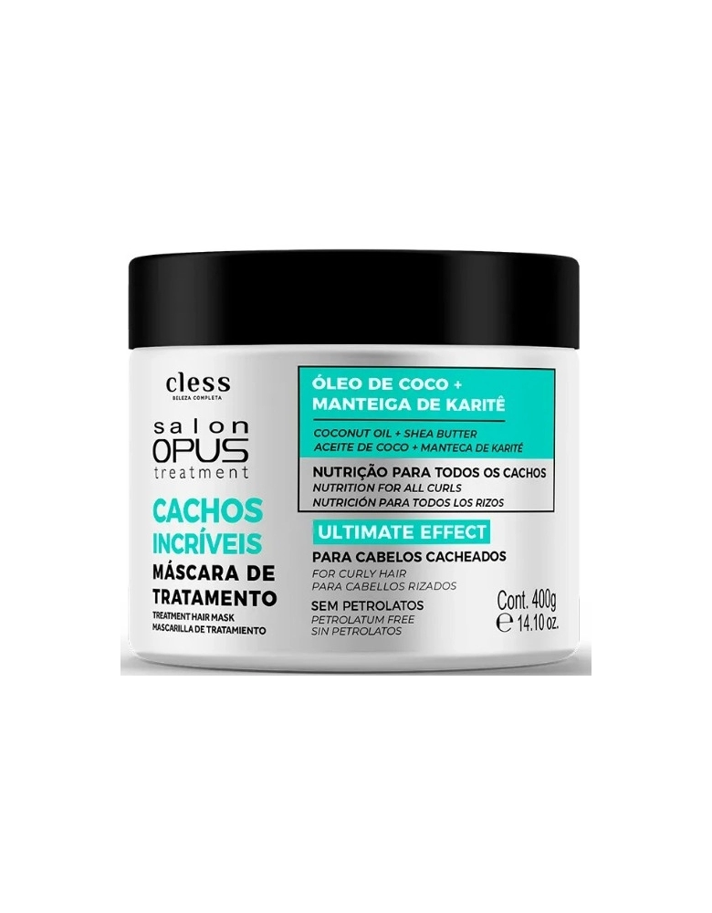 A Máscara de Tratamento Salon Opus Cachos Incríveis trata, hidrata, repara, define e flexibiliza os fios. Ideal para cabelos ondulados e cacheados, sua fórmula nutritiva e hidratante, regenera profundamente os fios, fecha as cutículas e recupera as fibras capilares. Tratamento que condiciona e devolve os nutrientes essenciais, selando os fios, nutre e hidrata sem pesar, proporcionando flexibilidade e brilho, facilitando o penteado. Seus cachos serão incríveis, bem definidos, modelados, soltos e hidratados.